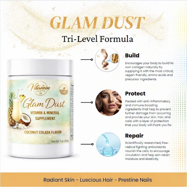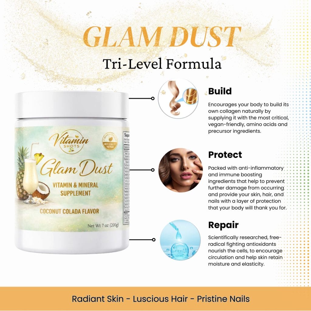 Glam Dust is a vegan collagen booster featuring a tri-level formulation designed to enhance skin, hair,